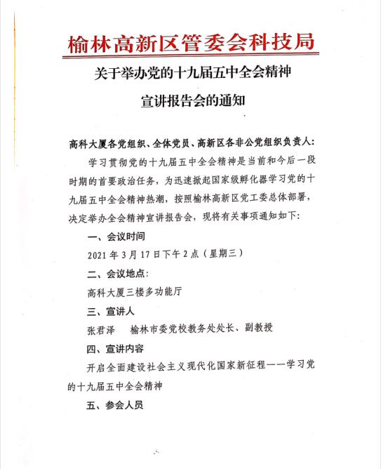 2020年10月26日至29日,中國共產(chǎn)黨第十九屆中央委員會第五次全體會議在北京召開。這次全會是在全面建成小康社會勝利在望、全面建設(shè)社會主義現(xiàn)代化國家新征程即將開啟的重要?dú)v史時(shí)刻召開的一次十分重要的會議。因此,榆林高新區(qū)黨工委總體部署,決定舉辦全會精神宣講報(bào)告會議,將全面深入學(xué)習(xí)黨的十九屆五中全會精神作為最重要的政治任務(wù)抓牢抓實(shí)。