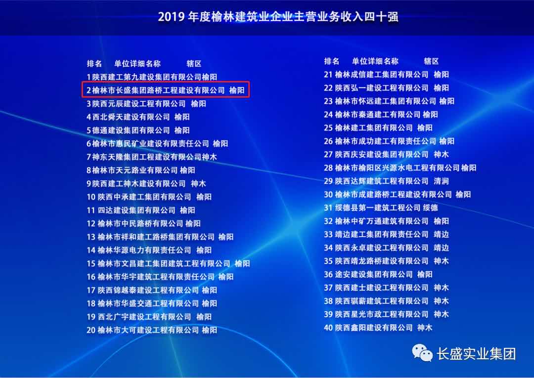 12月22日,榆林市人民政府新聞辦公室召開(kāi)2019年榆林市“五上”企業(yè)新聞發(fā)布會(huì),長(zhǎng)盛路橋入榜建筑企業(yè)主營(yíng)業(yè)務(wù)收入四十強(qiáng),長(zhǎng)盛路橋入榜民營(yíng)企業(yè)主營(yíng)業(yè)務(wù)收入百?gòu)?qiáng),長(zhǎng)盛地產(chǎn)入榜房地產(chǎn)開(kāi)發(fā)經(jīng)營(yíng)企業(yè)主營(yíng)業(yè)務(wù)收入二十強(qiáng)。