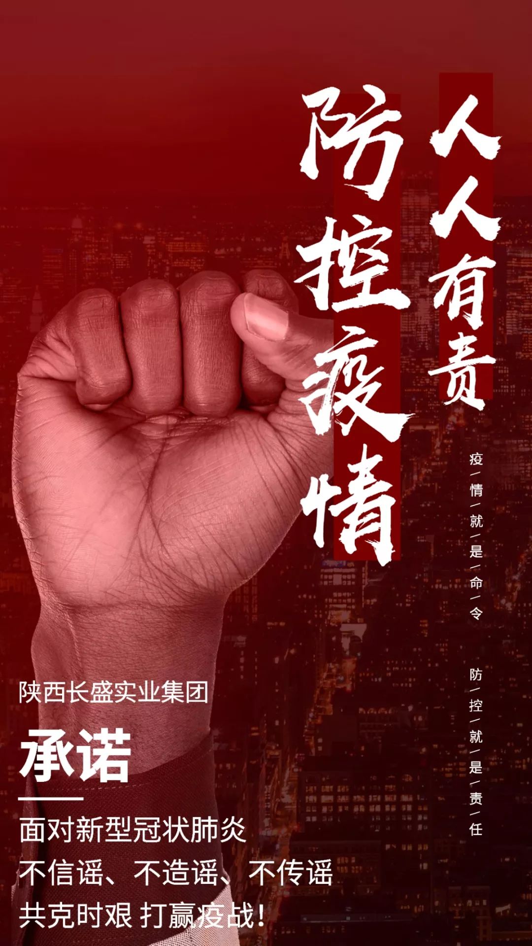 疫情無情人有情,陜西長盛實業(yè)集團將繼續(xù)按照各級主管部門工作要求,帶頭落實好疫情防控的各項措施,配合各級部門開展工作,同心協(xié)力維護社會穩(wěn)定大局,鼓勵和支持員工堅定信心、科學防控,為戰(zhàn)“疫”出力。