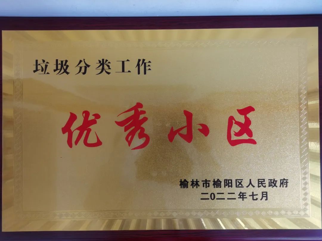 近日,因垃圾分類工作卓有成效。榆林市萬邦物業(yè)管理有限公司所接管的盛景家苑小區(qū)被榆陽區(qū)政府授予并由榆陽區(qū)環(huán)衛(wèi)局頒發(fā)垃圾分類優(yōu)秀小區(qū),并給授予了獎(jiǎng)牌和綬帶。