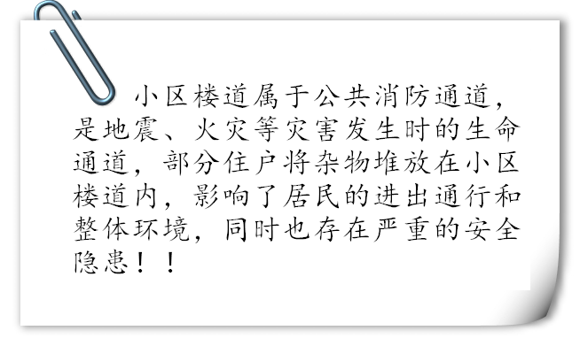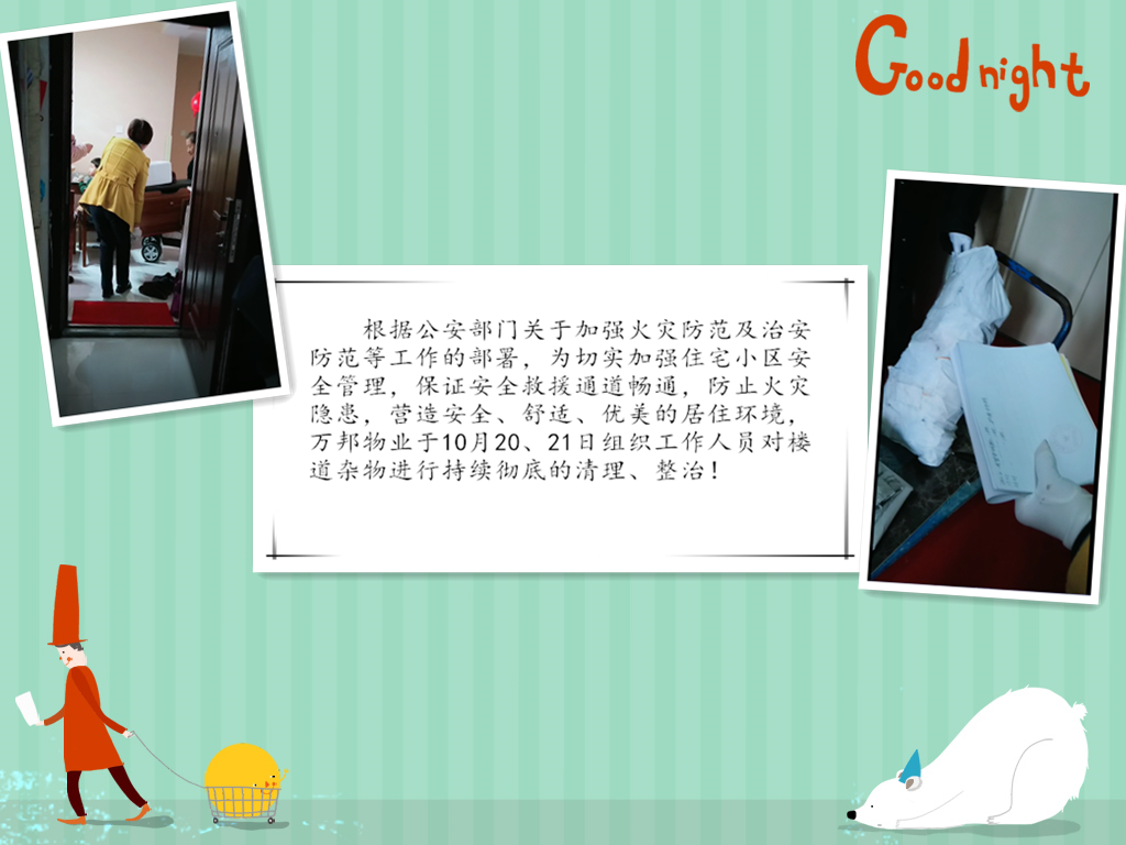 根據(jù)公安部門(mén)關(guān)于加強(qiáng)火災(zāi)防范及治安防范等工作的部署,為給業(yè)主創(chuàng)造一個(gè)優(yōu)美、舒適、安全的居住環(huán)境。我物業(yè)公司一直堅(jiān)持不懈的做著此工作,本月針對(duì)長(zhǎng)期占用公共區(qū)域堆放雜物的業(yè)戶(hù)進(jìn)行統(tǒng)一上門(mén)清理,并向業(yè)主傳達(dá)相關(guān)消防法律知識(shí)。